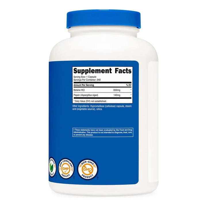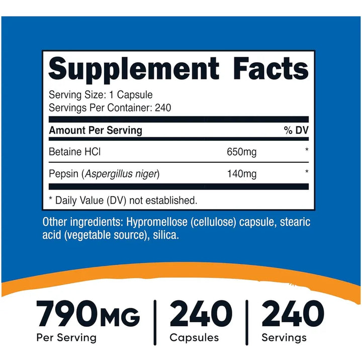 Betaína Hcl Con Pepsina 790 Mg 240 Cápsulas Digestión Saludable