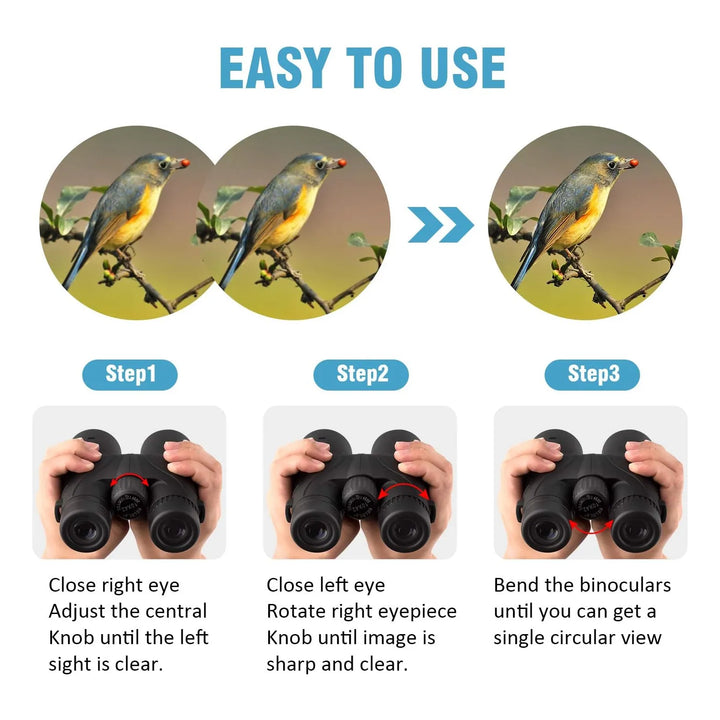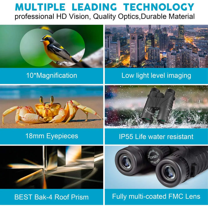 ¿Cansado de perderte los detalles? Los binoculares Binoteck te ofrecen un aumento de 10x y un campo de visión amplio, permitiéndote capturar imágenes claras y brillantes incluso a largas distancias. Su lente FMC multicapa y prisma BAK4 garantizan colores vibrantes y una nitidez incomparable, perfectos para observación de aves, caza, conciertos o viajes.