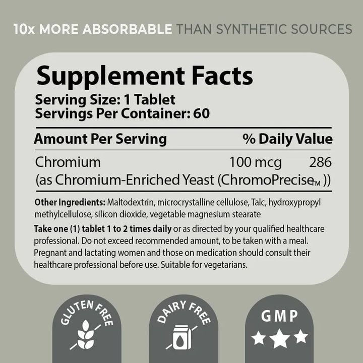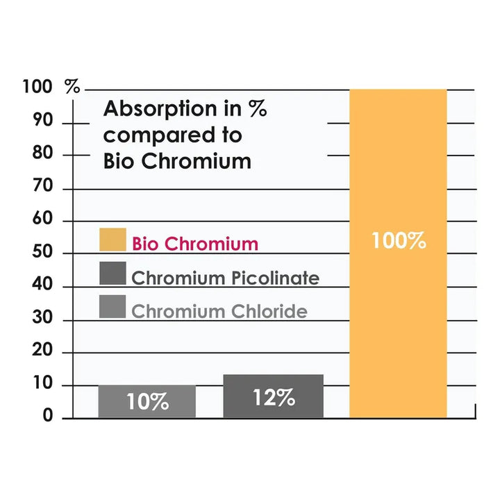 Este suplemento utiliza cromo en su forma orgánica, ChromoPrecise, lo que permite una absorción más eficiente y rápida por el cuerpo humano. Esta mayor biodisponibilidad potencia los efectos del cromo, ayudando a regular los niveles de azúcar en sangre y reduciendo los antojos que a menudo llevan al consumo excesivo de alimentos poco saludables.