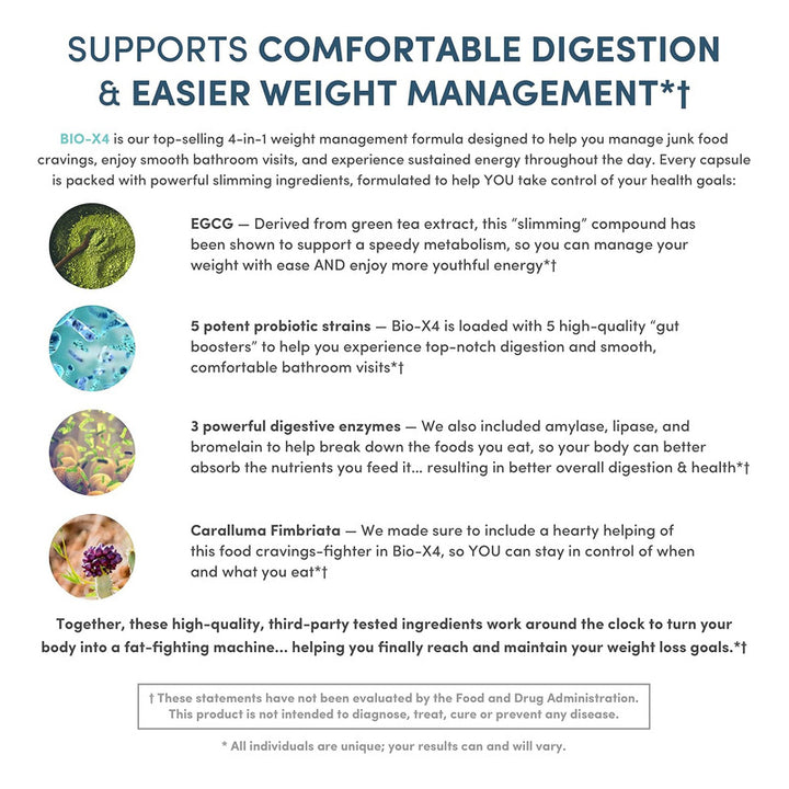 No es solo otro probiótico; Bio-X4 es un potente 4 en 1. Cada cápsula está formulada científicamente para equilibrar el sistema digestivo, acelerar el metabolismo, limitar los antojos de alimentos poco saludables y apoyar tus esfuerzos de pérdida de peso más persistentes. Piensa en la confianza y satisfacción de ver resultados reales en el espejo y sentirte radiante por dentro. ✨