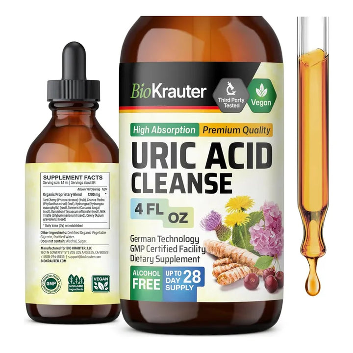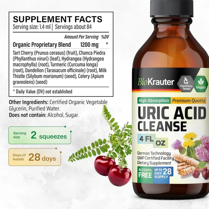 El BioKrauter actúa desintoxicando el sistema renal, facilitando la eliminación del ácido úrico gracias a su mezcla de cereza ácida, cardo mariano y cúrcuma. Al integrarse bien en tu rutina diaria, desbloquea un camino más limpio y saludable hacia el bienestar.