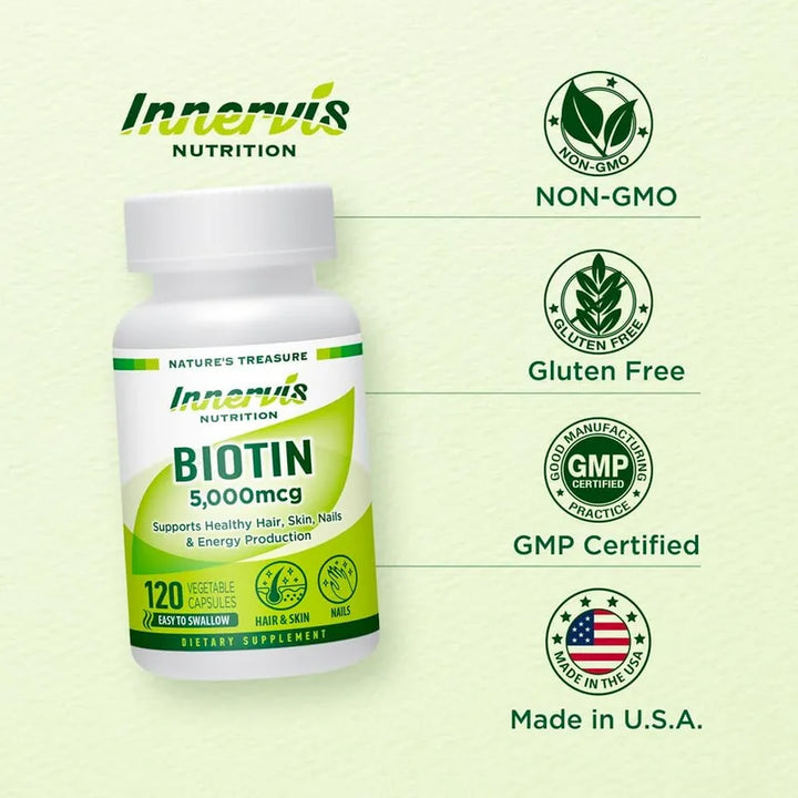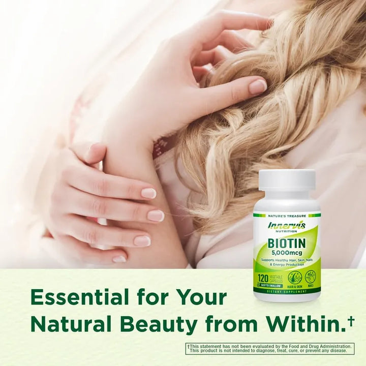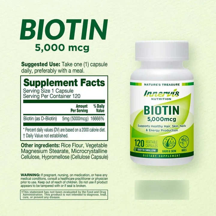 La biotina es reconocida por sus propiedades excepcionales que promueven un cabello más fuerte, una piel radiante y unas uñas saludables. Pero, ¿qué hace que nuestro producto se destaque? Te traemos una fórmula de alta potencia con 5000 Mcg por cápsula, diseñada especialmente para apoyar un crecimiento óptimo del cabello y una piel deslumbrante.