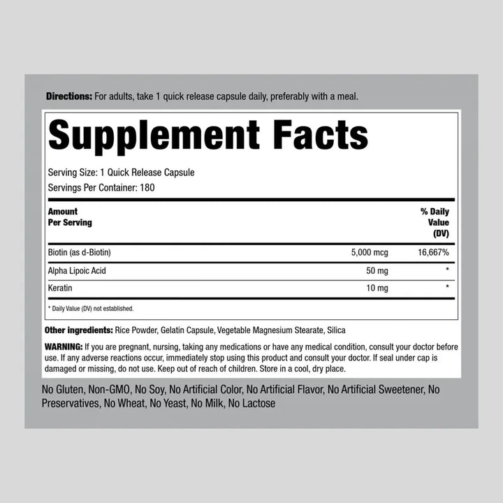 Biotina 5000mcg 180 Capsulas Con Queratina Y Acido Alfa Lipoico Suplemento Sin Gluten