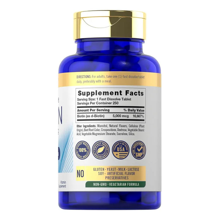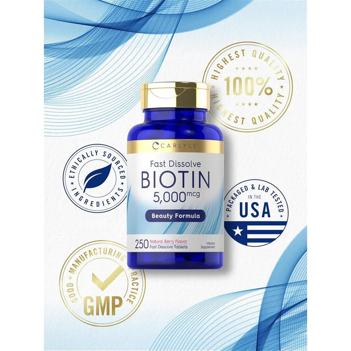 No es solo un suplemento, es una experiencia. Cada tableta está diseñada para disolverse rápidamente, permitiendo que 5000mcg de biotina ingresen a tu sistema de manera eficiente, para que puedas ver y sentir la diferencia.
