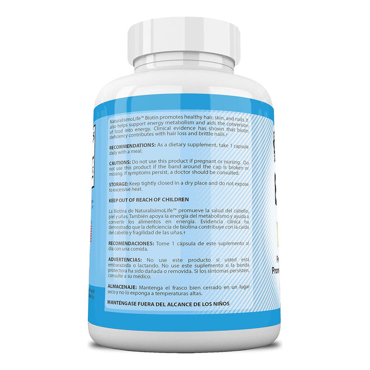 El problema de la pérdida de cabello y las uñas debilitadas ya no tienen por qué atormentarte. Con NaturalisimoLife Biotin, no solo combatirás estos síntomas, sino que te llevarás un aliado en la conversión de alimentos en energía. Estamos aquí para apoyarte en tu camino hacia una mejora visible y más energía a diario. ¿Te imaginas lo maravilloso que sería sentirte revitalizado cada mañana?