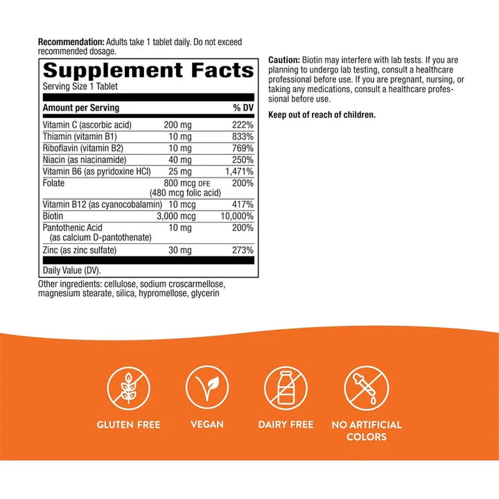 Cada tableta de Nature's Way Biotin Forte con Zinc está formulada con una combinación única de ingredientes que no solo cuida de tu cabello y uñas, sino que también mejora el tejido muscular y el sistema nervioso. Estos beneficios se reflejan en tu exterior, dándote un brillo natural y una confianza renovada. 💪