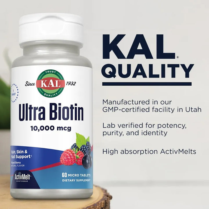 Imagina despertar cada mañana y ver tu cabello más fuerte y saludable. Eso es exactamente lo que nuestro suplemento de Biotina KAL Ultra 10000mcg ActivMelt promete ofrecerte. ¡No más días de cabello quebradizo y uñas débiles! Con nuestra fórmula de alta potencia, cargarás tu belleza desde dentro.