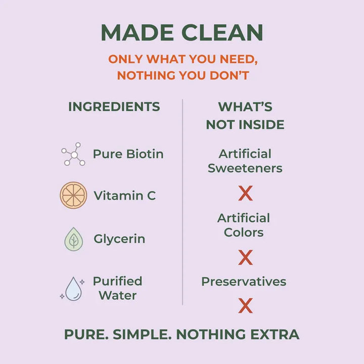 Esta biotina líquida es sinónimo de practicidad. Con solo unas gotas diarias, podrás sentir la diferencia en pocos días. Todo sin rellenos ni aditivos artificiales. Nuestra fórmula es pura y limpia, libre de azúcar, gluten, y conservantes artificiales. Solo ingredientes premium para ofrecerte lo mejor.