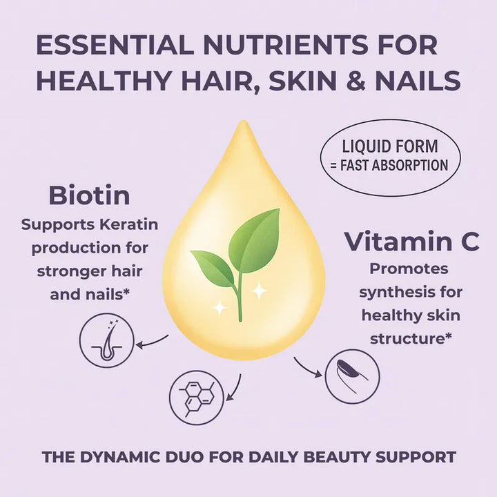 ¿Sabías que la biotina es conocida como la vitamina de la belleza? Imagina una fórmula que contiene 10,000 mcg de biotina por porción, diseñada especialmente para una rápida absorción. Esta fórmula no solo te ofrece vitalidad a pleno, sino que también incluye vitamina C. Una combinación perfecta para promover la producción natural de colágeno, ayudando a mantener una piel y cabello fuertes y saludables.