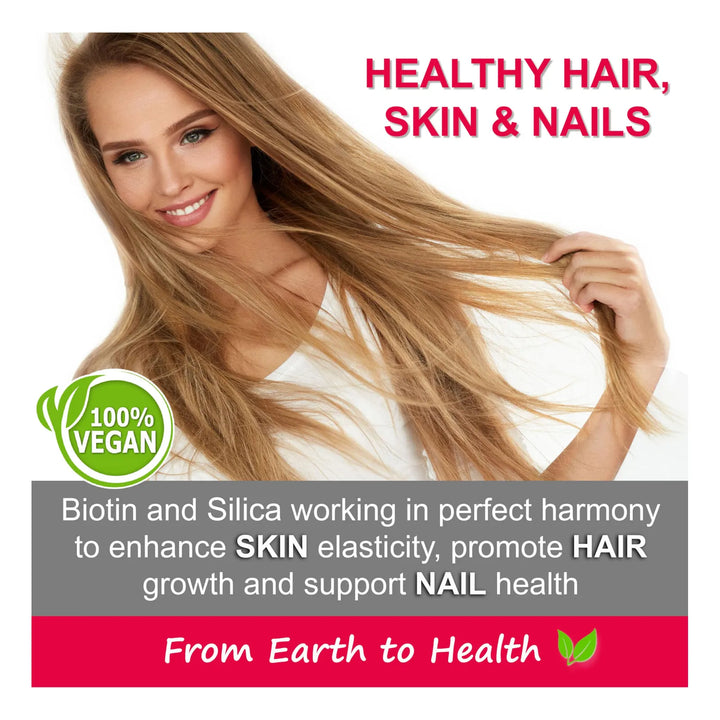 La biotina (vitamina B7) y el sílice trabajan juntos para estimular la producción de colágeno y queratina, proteínas esenciales para la salud de tu cabello, piel y uñas. La biotina fortalece la estructura celular, mientras que el sílice mejora la elasticidad y regeneración de los tejidos. Juntos, no solo reparan daños existentes, sino que previenen futuros problemas, ofreciéndote una belleza duradera y natural.