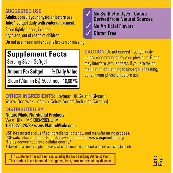 Nuestra biotina es más que solo un suplemento; es una promesa de calidad y efectividad. Con verificación de la Farmacopea de los Estados Unidos (USP), asegura una pureza y potencia que respaldan tu bienestar diario. Al elegir Nature Made, confías en una marca recomendada por farmacéuticos que se dedica a crear productos basados en investigaciones científicas.