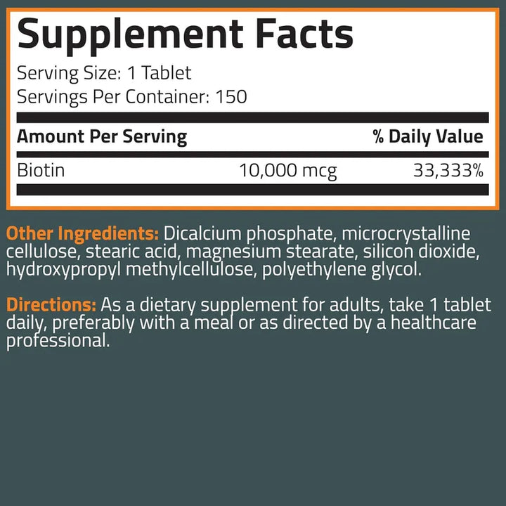 La Biotina trabaja como coenzima en el cuerpo, fundamental en la metabolización de grasas, carbohidratos y proteínas, asegurando que estos nutrientes se utilicen de manera eficiente, beneficiando la salud de tu cabello, piel y uñas. Para utilizar el producto, simplemente toma una tableta cada día, preferiblemente con una comida, para optimizar su absorción y efectividad.