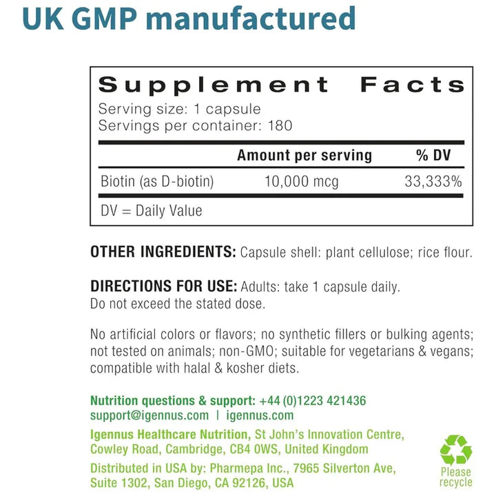 La ciencia detrás de nuestra biotina garantiza no solo la mejora visible de su belleza sino también un aumento en su energía y bienestar general. Con solo una cápsula diaria, obtendrá la dosis recomendada de 10,000 mcg de vitamina B7 que su cuerpo necesita para funcionar de manera óptima.