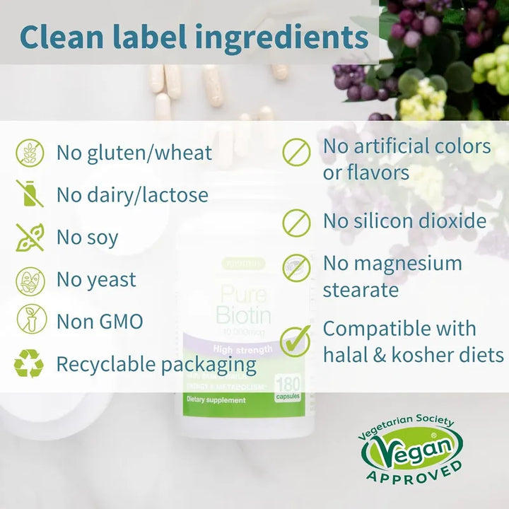 A diferencia de otras soluciones, nuestras cápsulas están elaboradas con ingredientes veganos y hipoalergénicos, garantizando que lo que ingiera sea absolutamente seguro y efectivo. Sin aditivos nocivos, cada cápsula encapsula el poder de la biotina en su forma más pura.