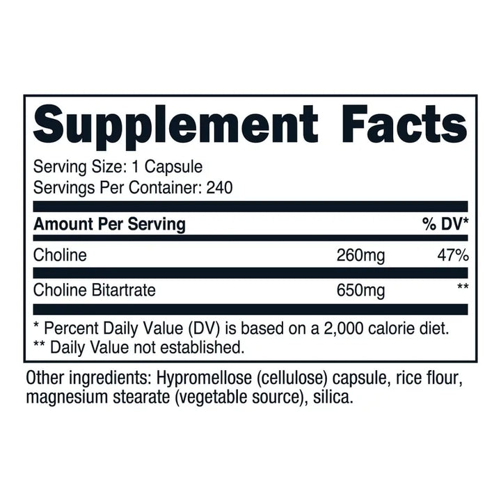 - 📌 Alta Concentración: Cada cápsula contiene 650 mg de bitartrato de colina.