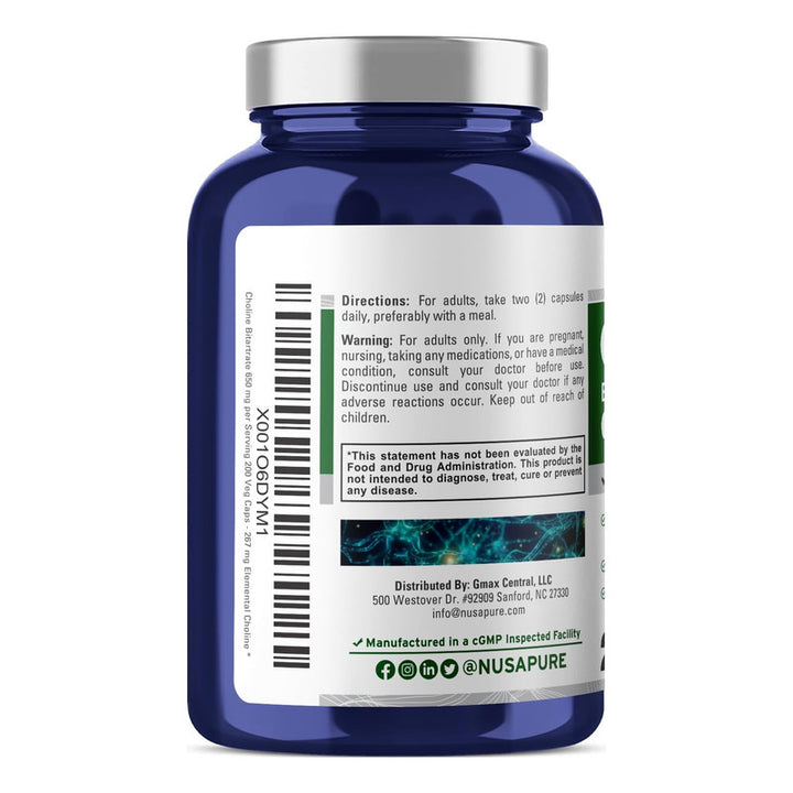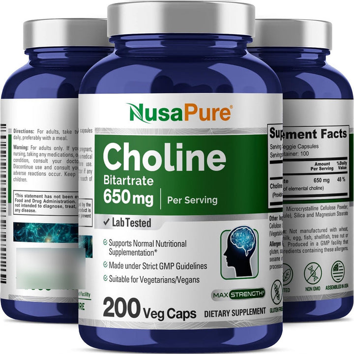 Bitartrato De Colina 650 Mg Nusapure Suplemento Cerebral Vegano 200 Capsulas