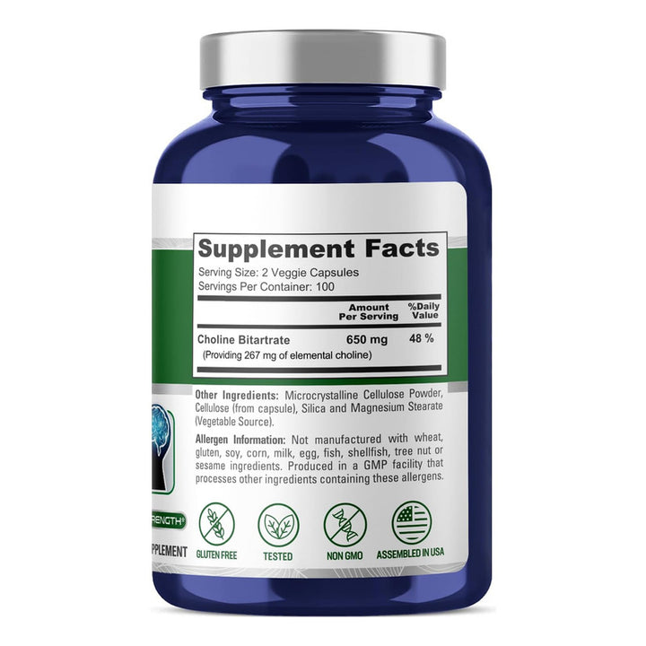 Imagina despertar cada mañana sintiéndote renovado y listo para enfrentar los desafíos del día. Con nuestras cápsulas de 650 mg de bitartrato de colina, experimentarás una claridad mental sin igual y una energía sostenida que te permitirá vivir plenamente. Nuestros ingredientes de alta calidad se ajustan perfectamente a las dietas veganas y vegetarianas, y son 100% libres de GMO y gluten, asegurando así que cada cápsula respete tu estilo de vida.