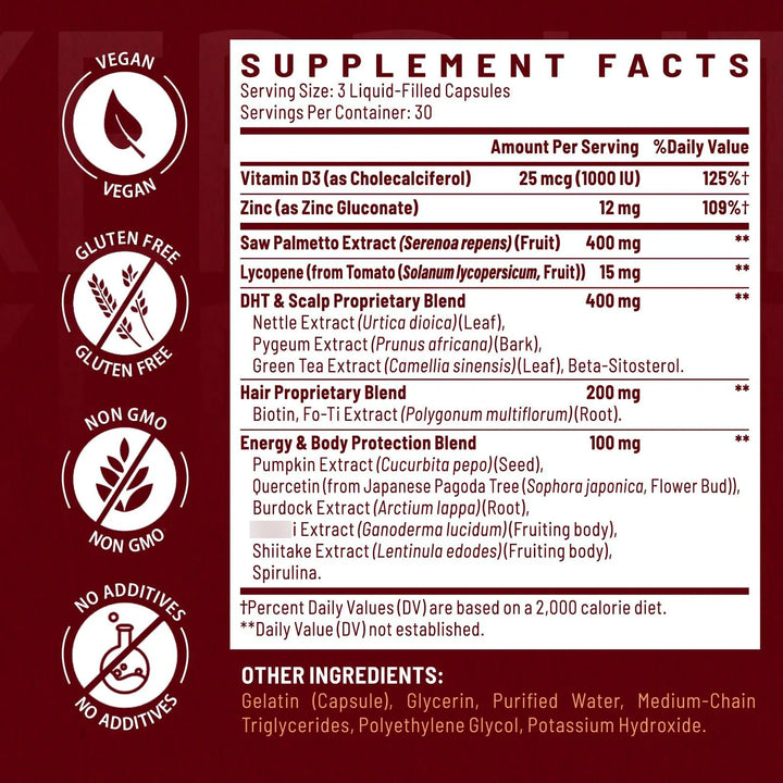 Este suplemento actúa regulando la producción de dihidrotestosterona (DHT), una hormona asociada con la caída del cabello en hombres. Al inhibir su acción, protege los folículos pilosos y estimula el crecimiento de cabello nuevo. Además, la combinación de palma enana americana y biotina nutre el cuero cabelludo, mejorando la circulación sanguínea y fortaleciendo cada hebra desde la raíz.