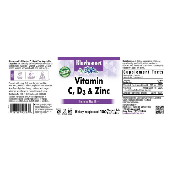 Bluebonnet Vitaminas C D3 Zinc Salud Inmunológica 100 Cápsulas