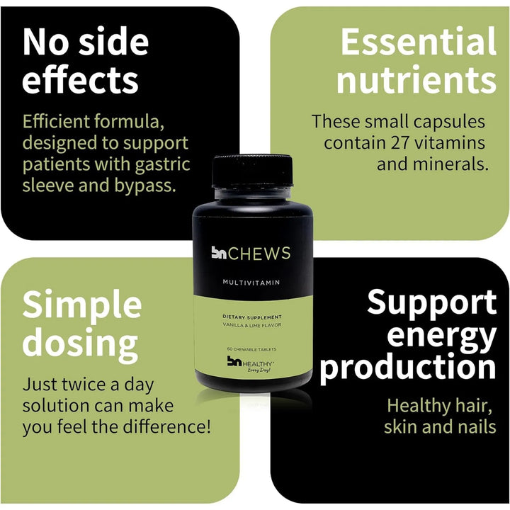 ¿Cansado de vitaminas difíciles de tragar o que no te dan los resultados que esperas? Imagina un suplemento que no solo nutre tu cuerpo, sino que también es fácil de tomar y tiene un sabor increíble. El BN Chews Vanilla & Lime Multivitamínico Bariátrico Masticable está diseñado para personas como tú, que buscan una solución práctica y efectiva para su bienestar diario.