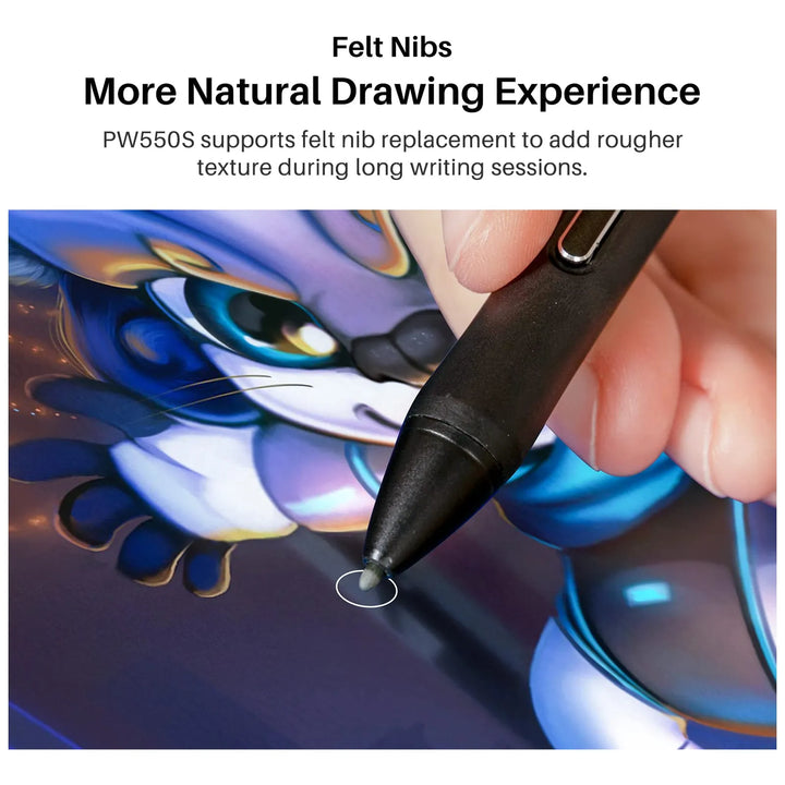 Compatible con una amplia gama de tabletas gráficas Huion, el PW550S es la herramienta perfecta para artistas tradicionales y digitales. Su punta mejorada te ofrece una visión clara sin obstrucciones, mientras que su larga vida útil sin necesidad de batería te libera de preocupaciones. No dejes que herramientas mediocres limiten tu potencial. Con el PW550S, cada trazo cuenta una historia.