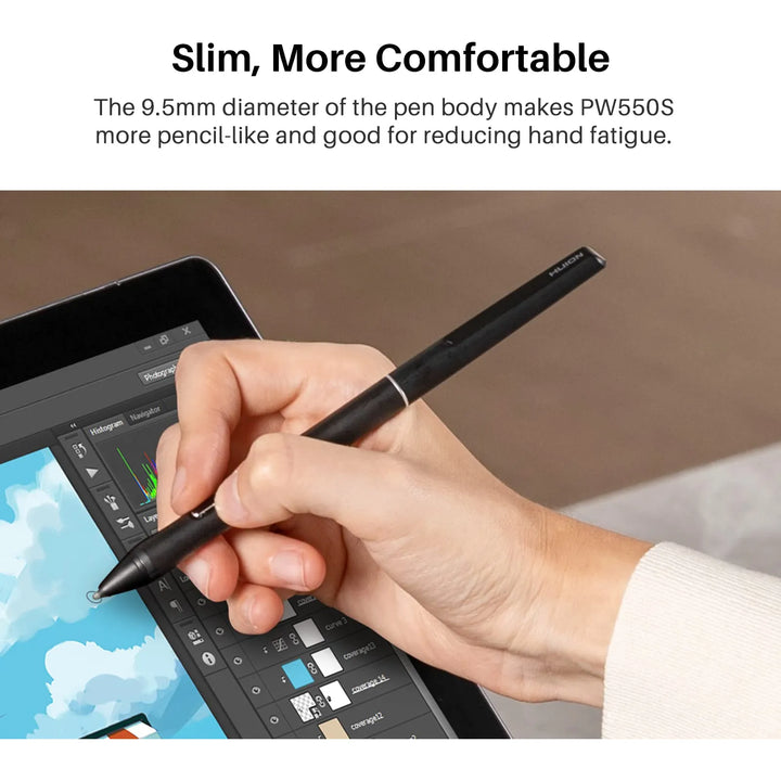 El PW550S utiliza tecnología PenTech 3.0 para detectar la presión y el ángulo de inclinación, permitiéndote controlar el grosor y la opacidad de tus trazos con precisión milimétrica. Su diseño sin batería garantiza que siempre esté listo para usar, eliminando la necesidad de cargas o mantenimiento complicado.