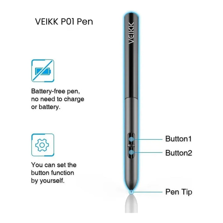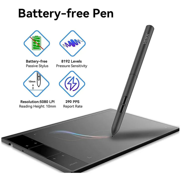 Este bolígrafo funciona mediante un sistema electromagnético que interactúa directamente con las tabletas de dibujo S640 y A30, permitiéndote realizar trazos finos y de alta precisión. Sin la necesidad de baterías, el dispositivo se alimenta directamente desde la tableta.