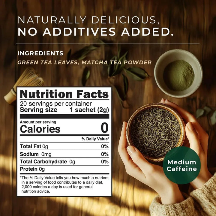 Nuestro té ha sido elaborado con la meticulosa selección de hojas finas de té verde y matcha en polvo provenientes de Japón, asegurando que solo lo mejor llegue a tu taza. Esta combinación proporciona un equilibrio perfecto entre un sabor aterciopelado y vegetal, y una dulzura sutil que energiza sin sensación de nerviosismo.