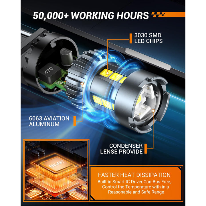 Estas bombillas funcionan gracias a los avanzados chips 3030-SMD, que ofrecen una salida de luz increíblemente fuerte y clara. La carcasa de aluminio de aviación garantiza que el calor se disipe rápidamente gracias al circuito integrado, que ajusta la temperatura optimizando el rendimiento.