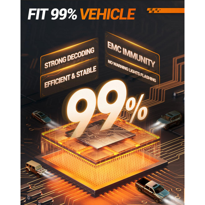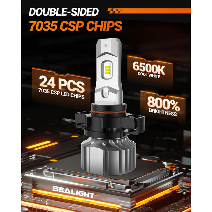 Las bombillas utilizan potentes chips CSP 7035 de doble fila, lo que se traduce en un brillo del 800%. Estos chips han sido distribuidos para emitir un haz de luz que alcanza 984 pies, penetrando niebla densa y lluvias, gracias a su diseño de gran angular que abarca varios carriles.