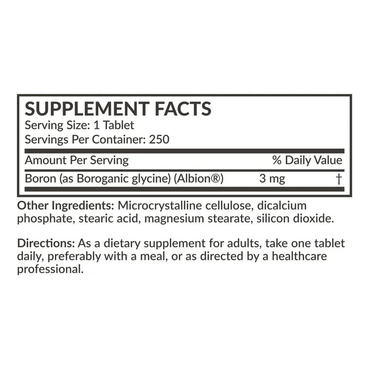 Esta forma avanzada de boro asegura no solo su absorción superior, sino también su estabilidad y calidad. Con 3 mg de alta pureza, cada tableta es una promesa de vitalidad y bienestar.
