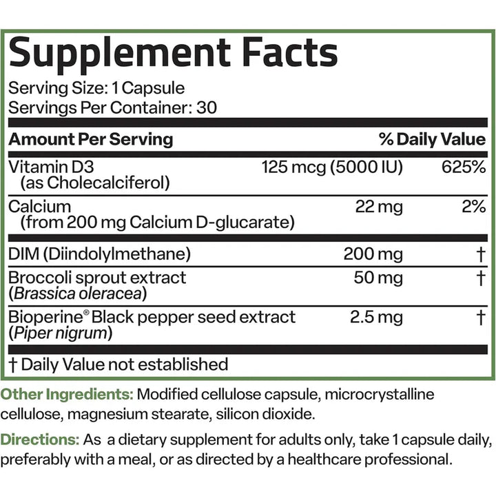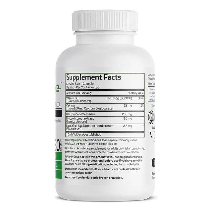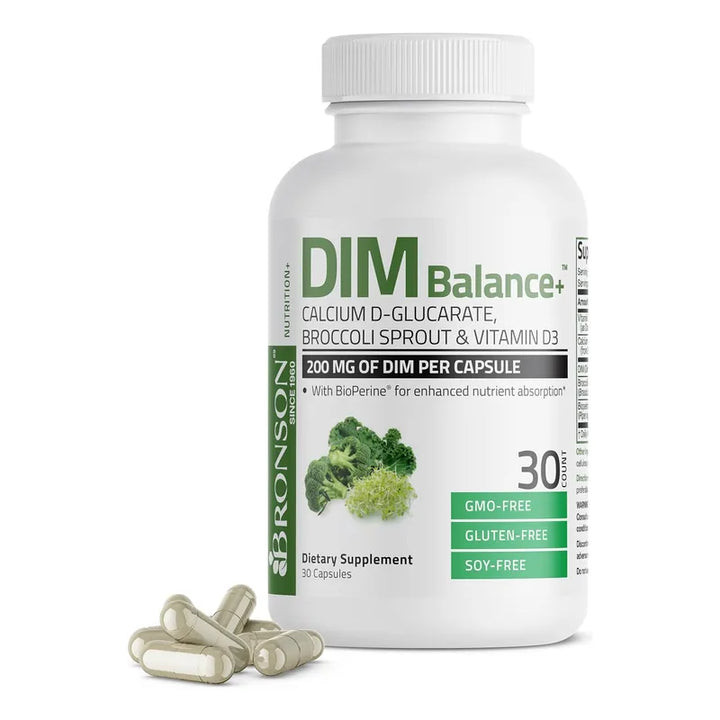 Cada cápsula de Bronson DIM Balance+ contiene 200 mg de DIM, un compuesto natural famoso por su capacidad para mejorar el metabolismo del estrógeno. Y eso no es todo, la fórmula incluye D-glucarato de calcio y brote de brócoli, conocidos por sus propiedades de desintoxicación. 🥦