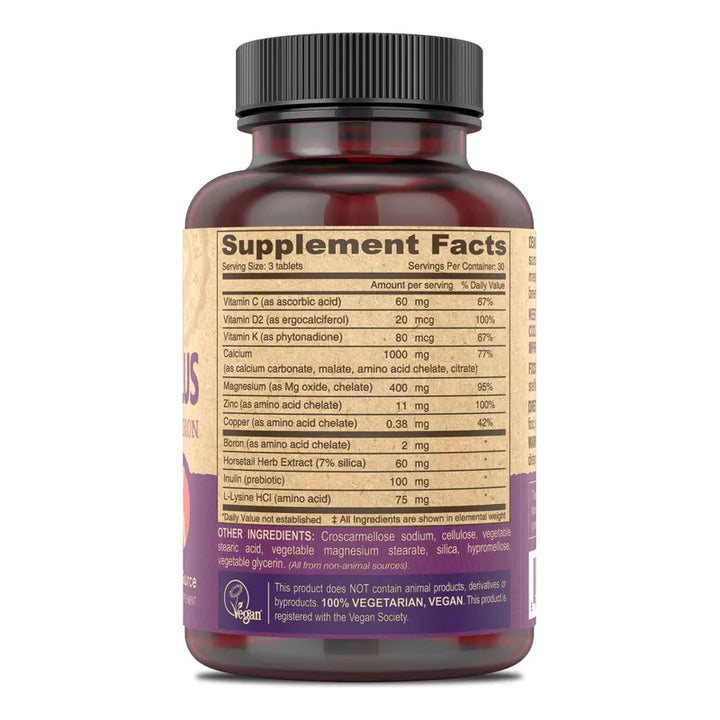 El suplemento proporciona múltiples fuentes de calcio junto con magnesio, zinc y vitaminas clave para potenciar la salud ósea y general. El calcio de distintas fuentes se absorbe de manera eficaz, ayudando a mantener la estructura normal y los procesos de desarrollo de los huesos. Otros componentes como el zinc y la vitamina C refuerzan el sistema inmune, mientras que el magnesio y las vitaminas D y K mejoran la absorción de calcio.