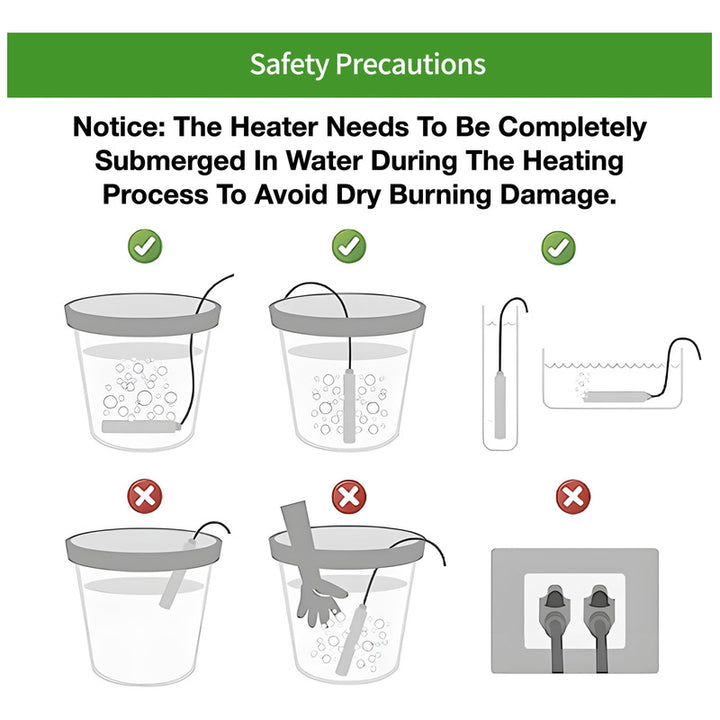 Aprovechar esta tecnología de punta es tan fácil como sumergir completamente el calentador en el agua y activar su controlador de temperatura. Esto garantiza un calentamiento seguro y efectivo. ¡Despreocúpate de los daños por combustión seca y mantén siempre los mejores resultados! 🌟