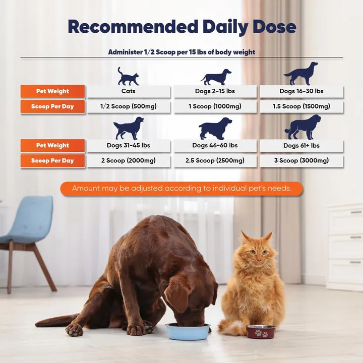 Viene en un práctico recipiente de 3.17 oz, haciendo que la dosificación diaria sea muy sencilla. Ya no tendrás que batallar para que tus mascotas tomen sus suplementos. Además, es ideal tanto para perros como para gatos, lo que lo convierte en una opción ideal para hogares con múltiples mascotas. 🐶🐱