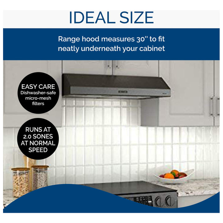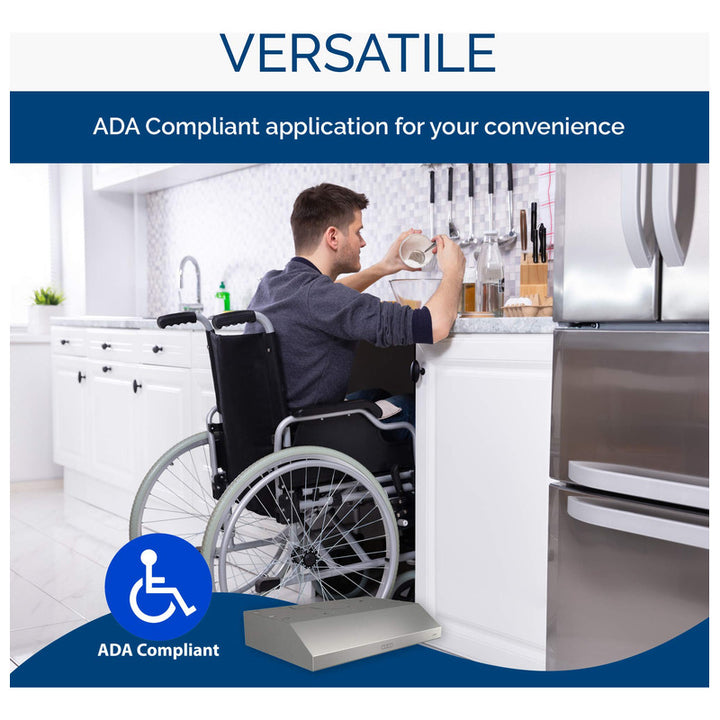Con nuestro diseño versátil, adaptado para cumplir con la ADA, esta campana es el complemento ideal para cualquier cocina. Su tamaño de 30 pulgadas la convierte en un ajuste perfecto debajo de tu cabina de cocina.