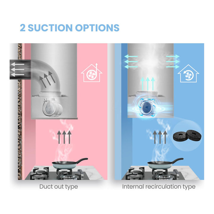 - La versatilidad del dispositivo te permite optar por una succión de salida por conducto para expulsar el aire completamente fuera de tu hogar o la recirculación interna, ideal si tu objetivo es filtrar grasa y olores en el mismo espacio.