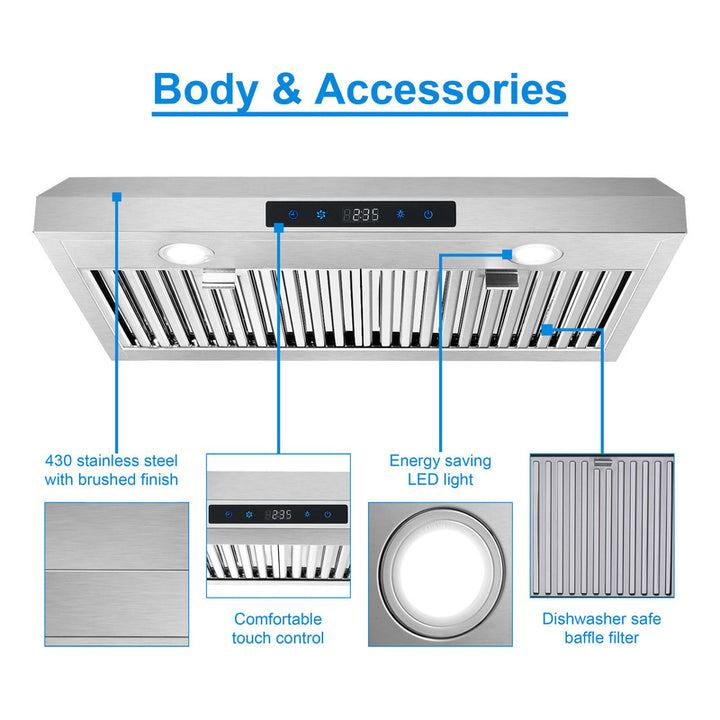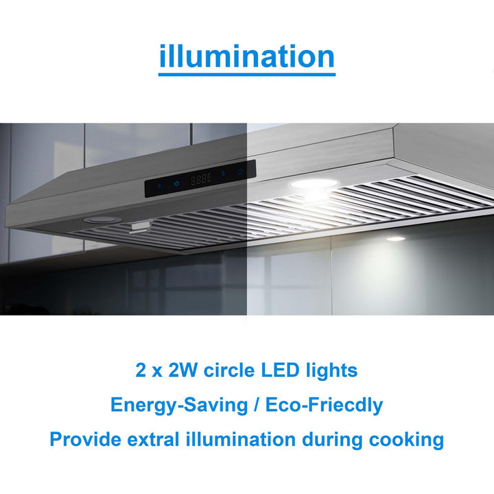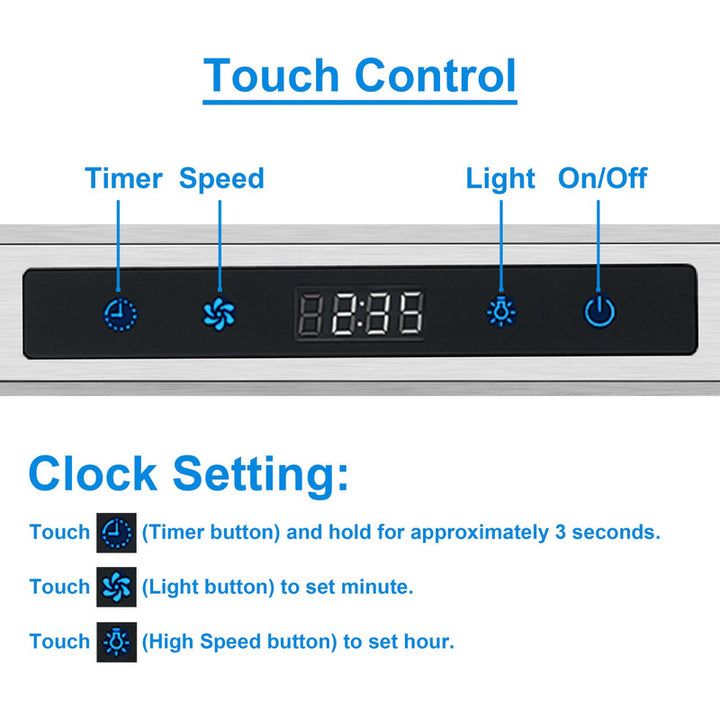 Olvídate de los complicados controles mecánicos. Con controles táctiles intuitivos, esta campana extractora te permite ajustar las tres velocidades del ventilador para eliminar los molestos olores y humos con un flujo de aire máximo de 500 CFM. Las dos luces LED, estratégicamente ubicadas, brindan una iluminación perfecta, asegurando que nada falte en tu rincón culinario.