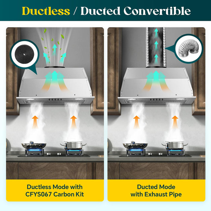 La personalización es clave para nosotros. Nuestra campana te brinda la flexibilidad de elegir entre un sistema de ventilación con ductos o sin ductos, según lo que tu cocina necesita. Con filtros de carbón opcionales, puedes convertirla fácilmente según tu preferencia.