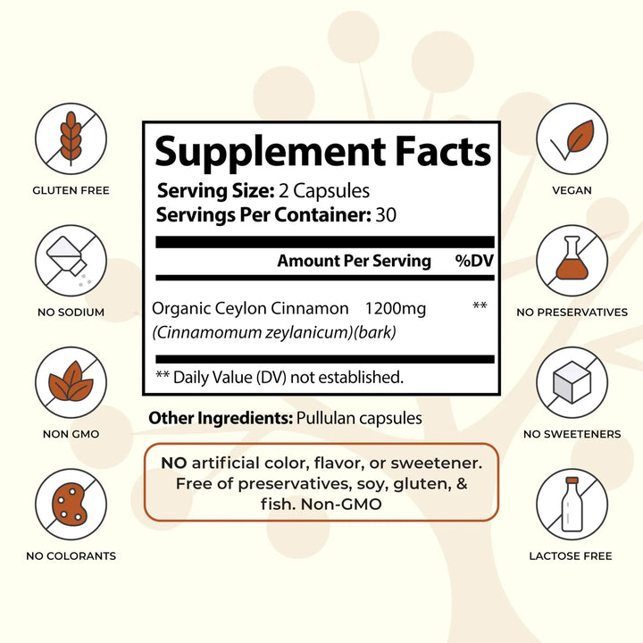 - Dosis óptima: 1200 mg de canela pura por porción (2 cápsulas). 💊