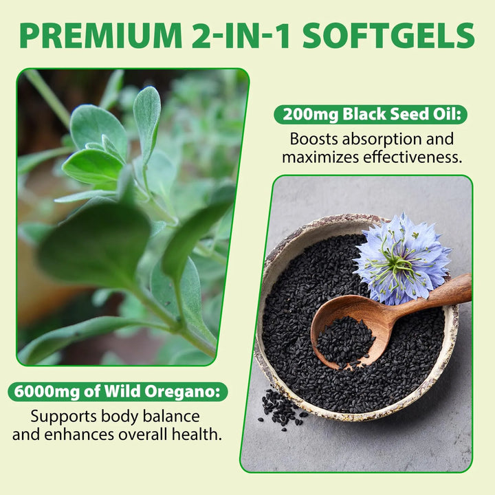 Imagina un suplemento que no solo fortalece tu sistema inmunológico, sino que también apoya tu digestión, promueve un equilibrio corporal óptimo y contribuye a tu bienestar general. Nuestras cápsulas de aceite de orégano y semilla negra están diseñadas para ofrecerte todo esto y más, en una fórmula 2 en 1 fácil de tomar y altamente efectiva.