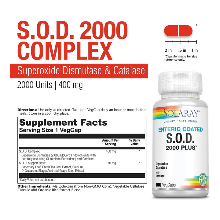 El Solaray S.O.D. 2000 Plus actúa directamente en tus células, neutralizando los radicales libres que aceleran el envejecimiento y debilitan tu sistema inmunológico. Su fórmula única combina superóxido dismutasa (S.O.D.), glutatión peroxidasa y catalasa, enzimas clave que tu cuerpo necesita para mantenerse fuerte y saludable. El recubrimiento entérico asegura que estos compuestos lleguen intactos al intestino, donde son absorbidos eficientemente.