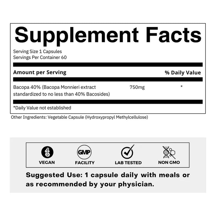 - Alta concentración: Cápsulas con 750mg de Bacopa Monnieri, asegurando un efecto potente. 💊