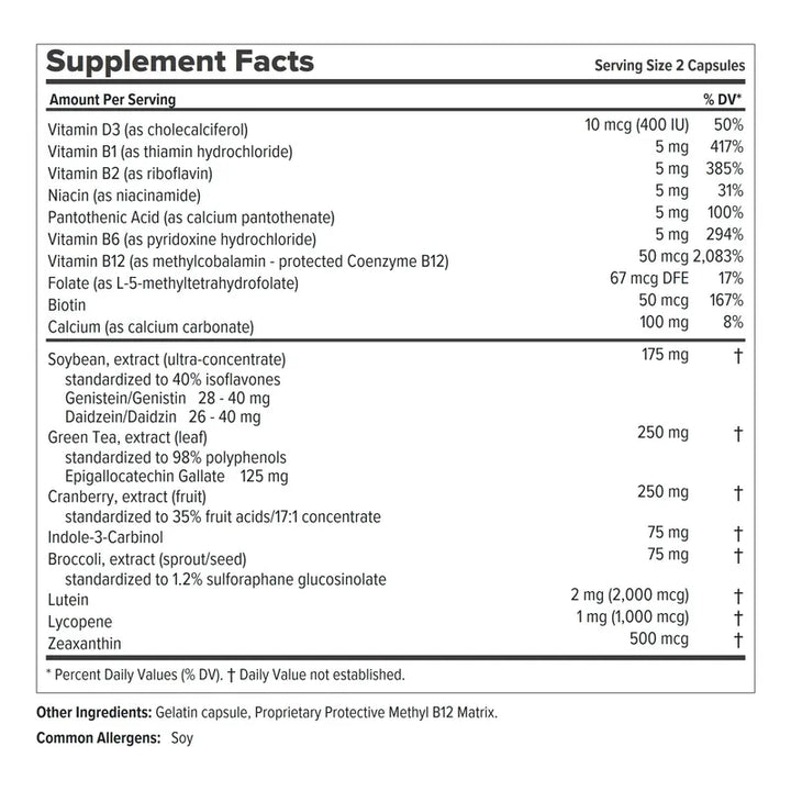 La fórmula se centra en equilibrar los niveles hormonales mediante ingredientes clave como las isoflavonas de soja, que imitan el efecto del estrógeno en el cuerpo, ayudando a mitigar los síntomas de la menopausia. La vitamina D3, junto con calcio, fortalece los huesos, mientras que los antioxidantes del té verde y el arándano apoyan la salud general.