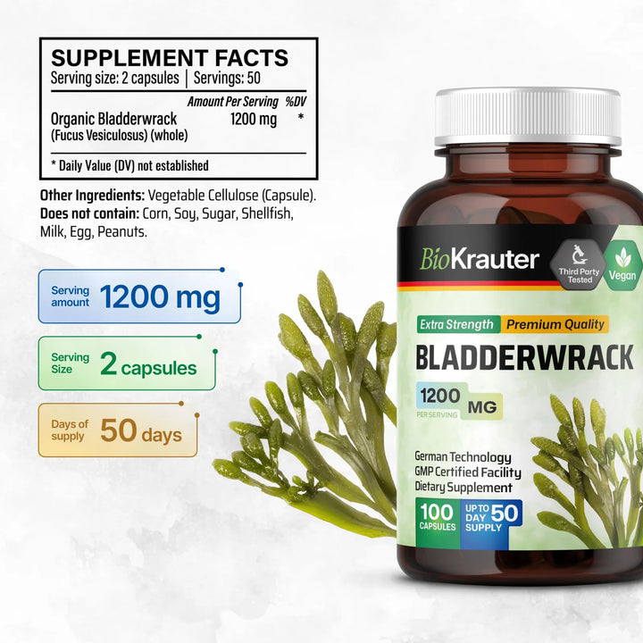 ¿Qué hace que estas cápsulas sean especiales? No solo son una fuente natural de yodo, sino que también están elaboradas con tecnología alemana, garantizando la máxima pureza y eficacia. Cada cápsula contiene la dosis precisa para que puedas disfrutar de sus beneficios durante 50 días. Además, su formato práctico te permite llevarlas contigo a cualquier lugar, facilitando tu rutina diaria. No dejes que la falta de energía o un sistema inmunológico debilitado te detengan. Con las cápsulas Bladderwrack, estás invirtiendo en tu salud de la manera más inteligente.