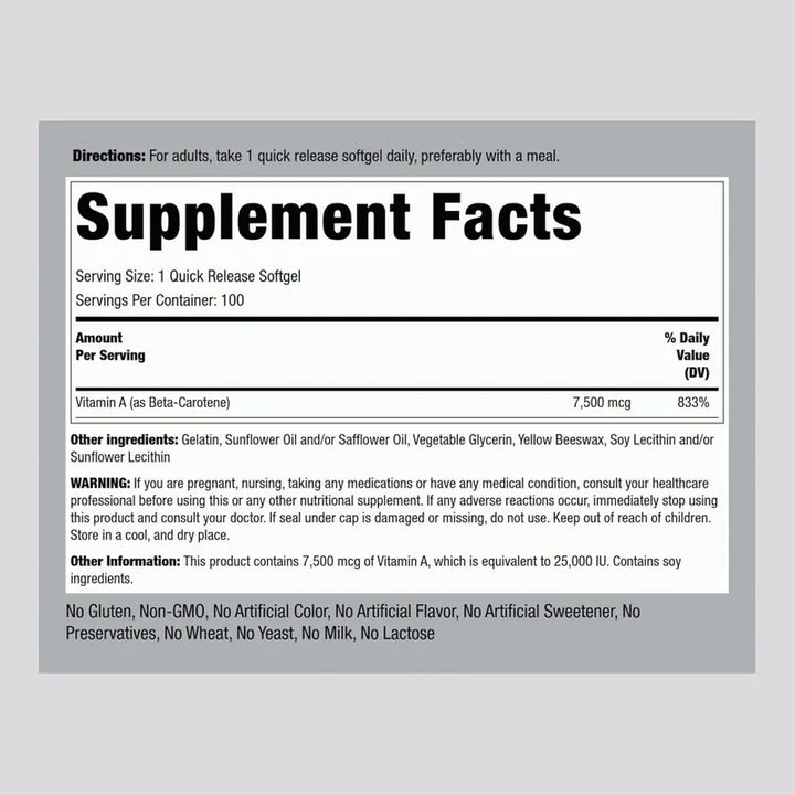 Todos podemos beneficiarnos de un pequeño empujón hacia un estilo de vida más saludable. Con estas cápsulas, puedes transformar tu día a día. La potencia de 25,000 UI de beta caroteno en cada cápsula te ofrece el cuidado especial que mereces, ayudándote a mantener tu vista, piel y sistema inmunológico en su punto óptimo. Es como tener una pequeña dosis de vitalidad que puedes tomar de manera fácil cada mañana.
