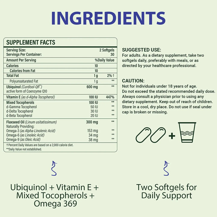 ¿Sientes que tu energía no es la misma de antes? ¿Buscas un impulso natural para tu corazón y bienestar general? Descubre el poder del ubiquinol, la forma más absorbible de CoQ10, enriquecido con vitamina E y Omega 3-6-9 para una protección antioxidante superior. Nuestras cápsulas blandas están diseñadas para quienes exigen lo mejor: máxima absorción, ingredientes de calidad y resultados que se sienten.