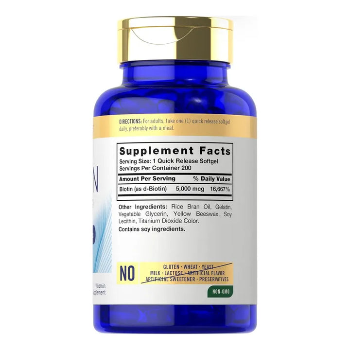 Nuestras cápsulas te ofrecen una fuerza extra de 5000 mcg de biotina en cada dosis. ¿Por qué conformarte con menos cuando puedes experimentar un cambio real en menos tiempo? Cada cápsula está especialmente formulada para liberarse rápidamente y maximizar su efectividad en tu cuerpo. La belleza comienza desde adentro, y estas cápsulas son el primer paso hacia un cabello más fuerte, una piel más luminosa y unas uñas más resistentes.