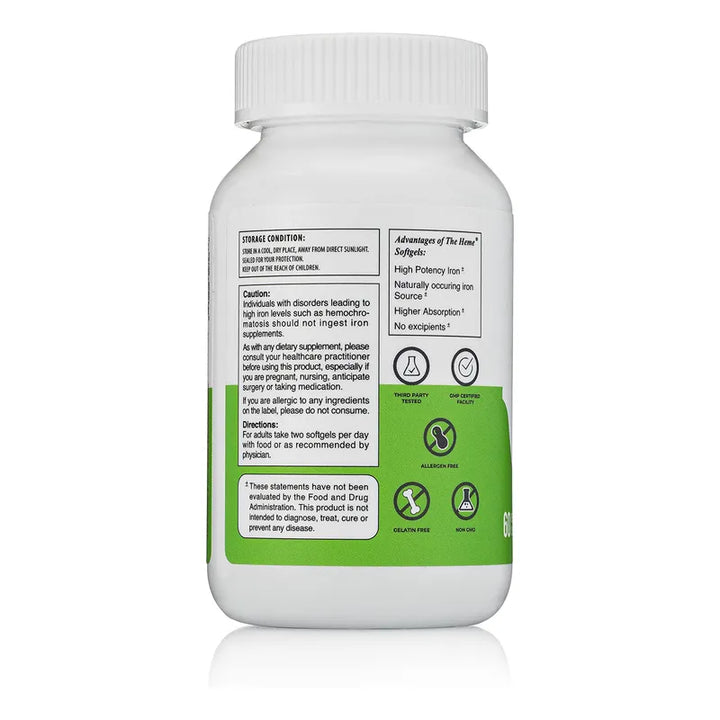 Nuestras cápsulas blandas están elaboradas a partir de polipéptido de hierro hemo, una forma de hemoglobina que se absorbe naturalmente mejorada por la presencia de vitamina C. Olvídate de sentirte agotado y comienza a disfrutar de tus días al máximo. Además, están libres de gluten y OMG, asegurando que disfrutes solo de lo mejor que la naturaleza puede ofrecerte. Con 60 unidades por frasco, estarás tomando un camino hacia una mejor salud con confianza y tranquilidad.