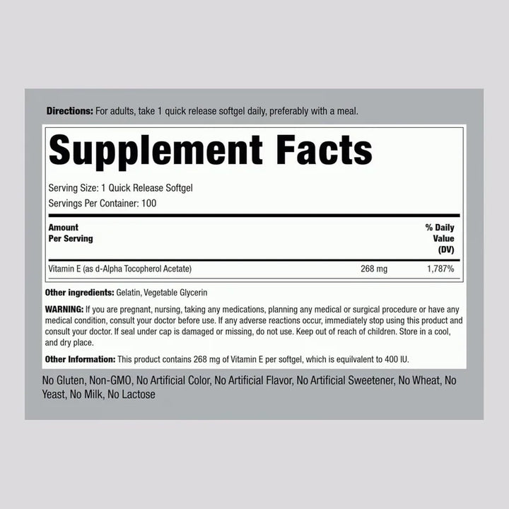 Gracias a su fórmula de alta potencia, estas cápsulas blandas proporcionan al cuerpo la dosis óptima de D-alfa tocoferol, un componente clave para tu sistema inmunológico. Además, al ser un suplemento sin OMG y sin gluten, asegura una tranquilidad única en cada ingesta, sin comprometer tus necesidades dietéticas o preferencias.